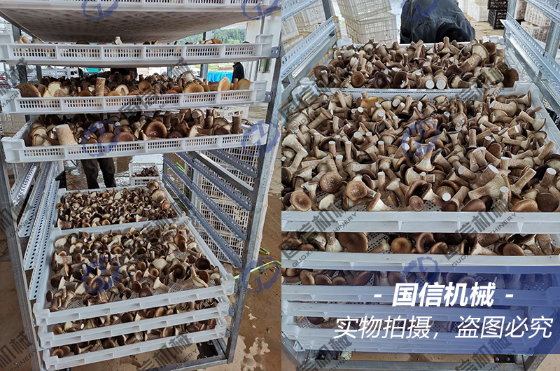 香菇烘干工藝對裝盤的要求嚴格。裝盤時,需將菌蓋朝上,菌柄朝下,均勻擺放,不能重疊或者堆積,防止對香菇造成損壞,從而影響質(zhì)量。建議采摘后的6個小時內(nèi)必須送入烘干房,如有剩余,則需放入冷庫進行冷藏。