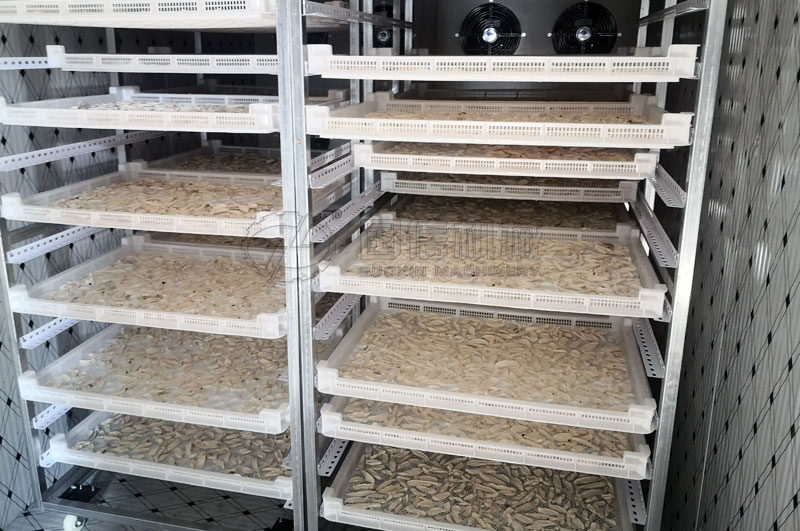 擺好切片的托盤,放在烘干箱烤架上,按大、小、碎三批烘好。大切片烘干時,溫度要高,烘干時間要長,溫度控制在80-100℃,時間為9個小時。小切片烘干時,溫度略低,時間略短,溫度控制在70-90℃,時間為6-7個小時。碎切片則溫度很低,時間*短,溫度控制在60-80℃,時間為5個小時。
